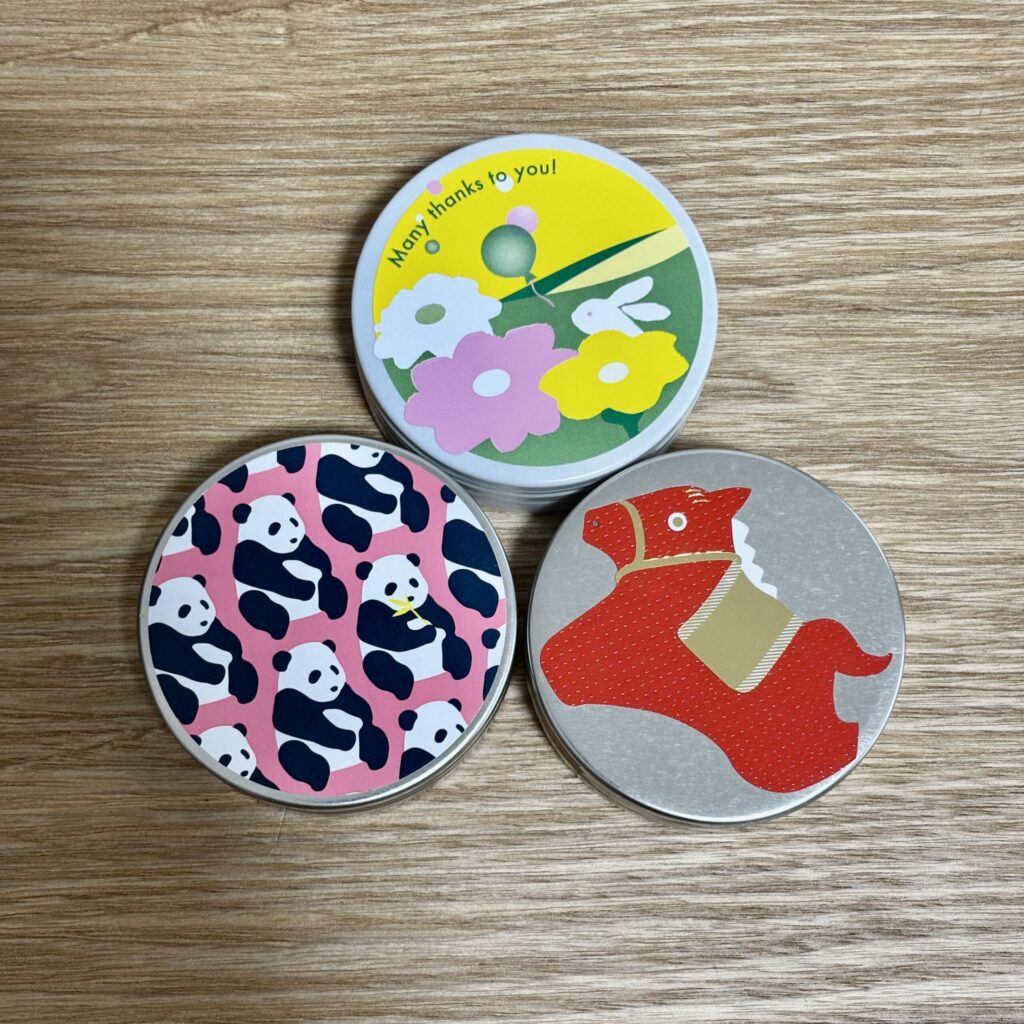 月替わりのお菓子はキャンディーやマシュマロなどがあります。缶のパッケージも可愛い!